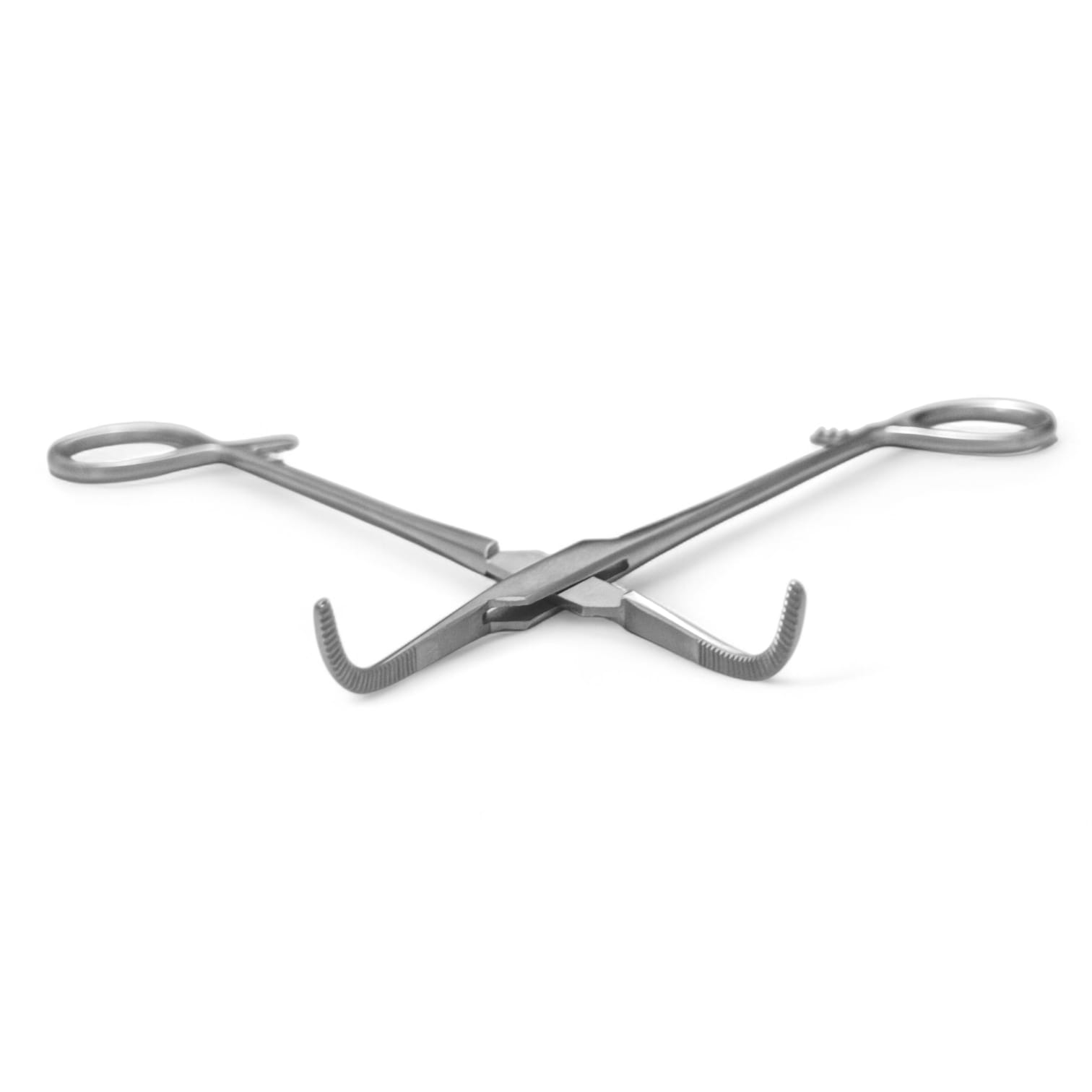 Fabricada em aço inoxidável cirúrgico de alta qualidade, é resistente à corrosão, durável e compatível com diversas técnicas de esterilização. A curvatura funcional e as mandíbulas serrilhadas garantem um agarre firme durante o clampeamento de tecidos ou vasos, minimizando traumas às estruturas anatômicas.